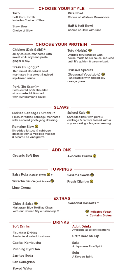 Chicken Taco with Romaine Slaw, PiKo de Gallo Steak Taco with Kimchi Slaw Pork Taco with Kale Slaw, Pickled Daikon All Topped with Lime Crema, Gochupow Sauce, Sesame Seeds, Cilantro & Crunchy Shallots